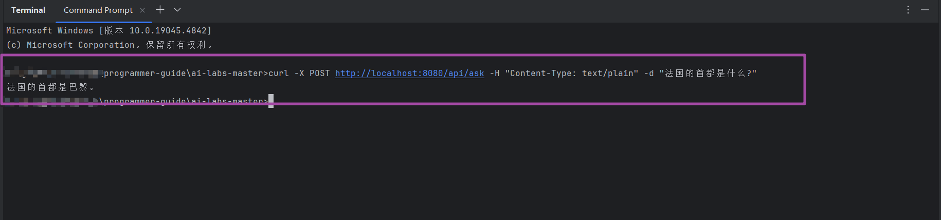 curl -X POST http://localhost:8080/api/ask -H "Content-Type: text/plain" -d "法国的首都是什么?"响应结果: