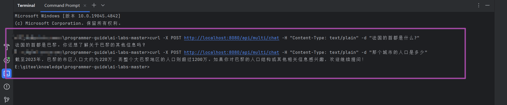 curl -X POST http://localhost:8080/api/multi/chat -H "Content-Type: text/plain" -d "那个城市的人口是多少"响应结果: